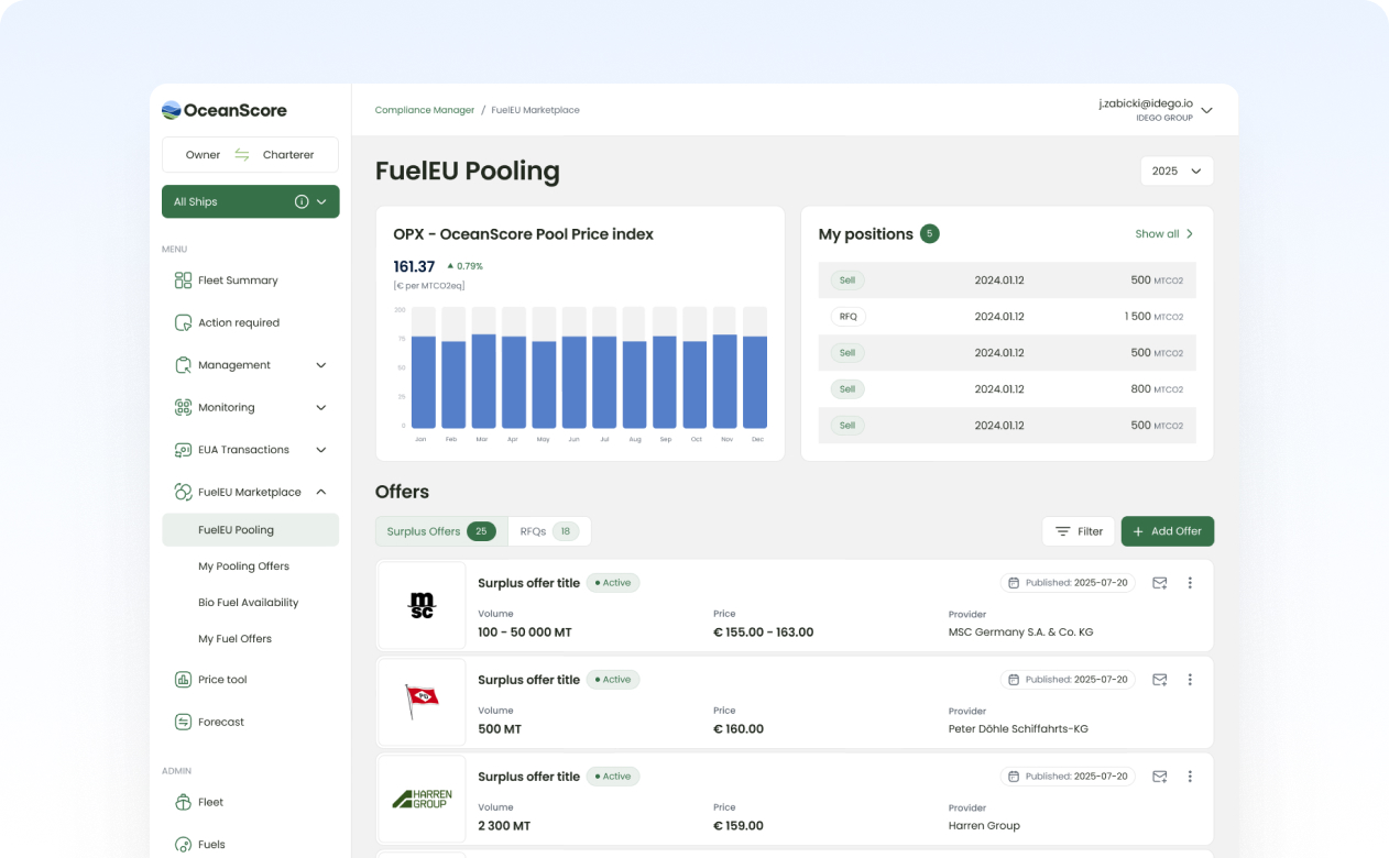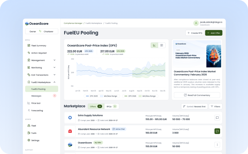 Access the most cost-efficient FuelEU Maritime compliance options and trade surplus through a transparent marketplace. Supported by OPX, OceanScore's transaction-based Pool-Price Index, providing an independent reference for pooling decisions.