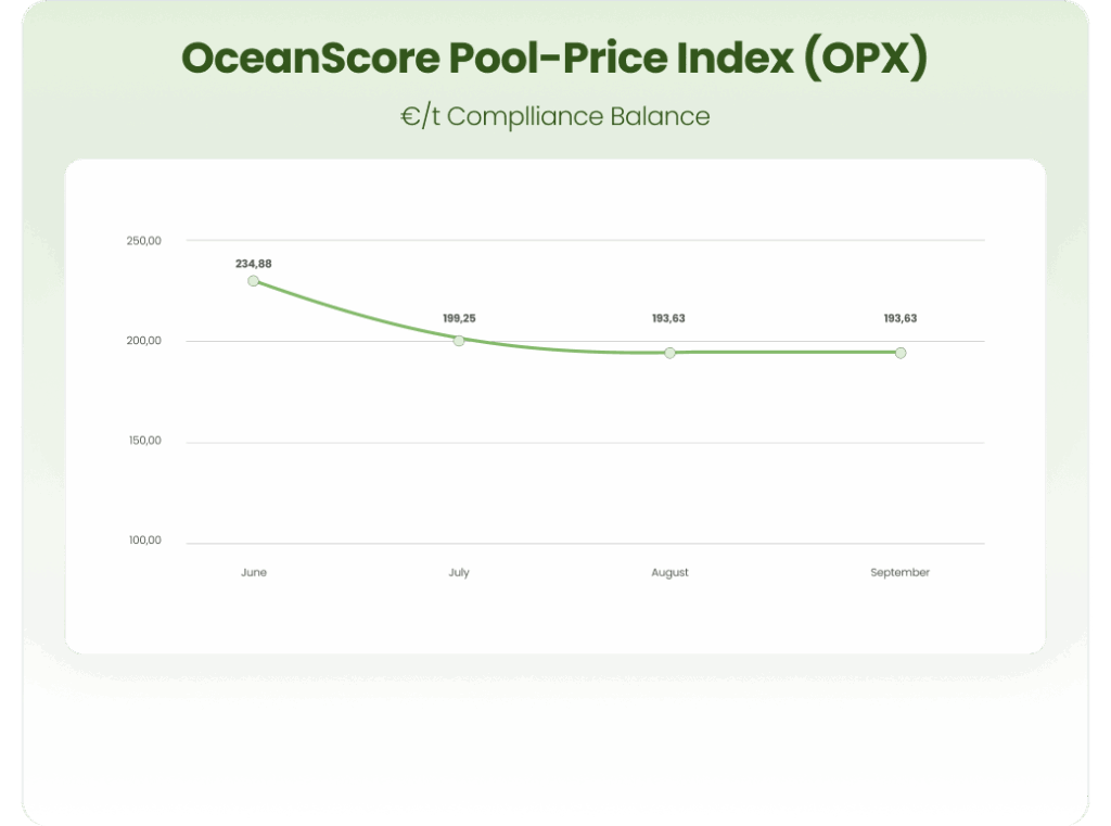 OceanScore’s OPX price for FuelEU Compliance Balances remained unchanged at €193 per ton of CO₂e in September – reflecting the bottoming out of prices expected by OceanScore’s analysis. Trading volumes have picked up after the summer break.