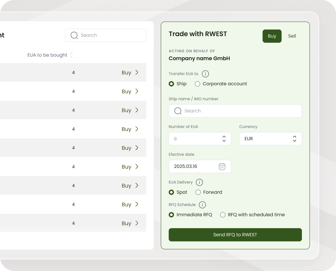 EUAs can be purchased on carbon markets. Prices are volatile, which makes timing and strategy critical. OceanScore integrates EUA trading into its platform, so companies can track needs in real time and secure competitive prices with trusted partners.