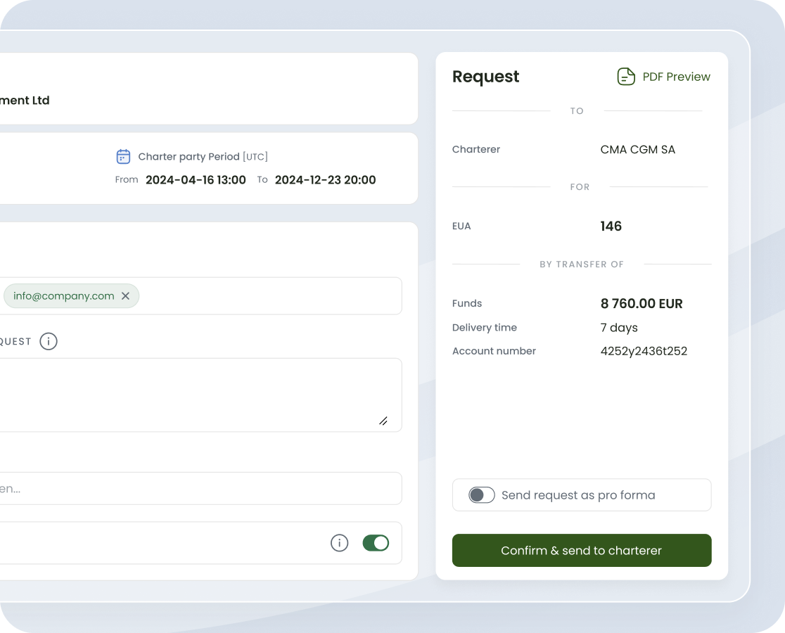 Automate key processes from data collection to EUA settlement, connect owners, operators, and charterers through one centralized workflow, and eliminate manual effort while reducing friction across all parties.